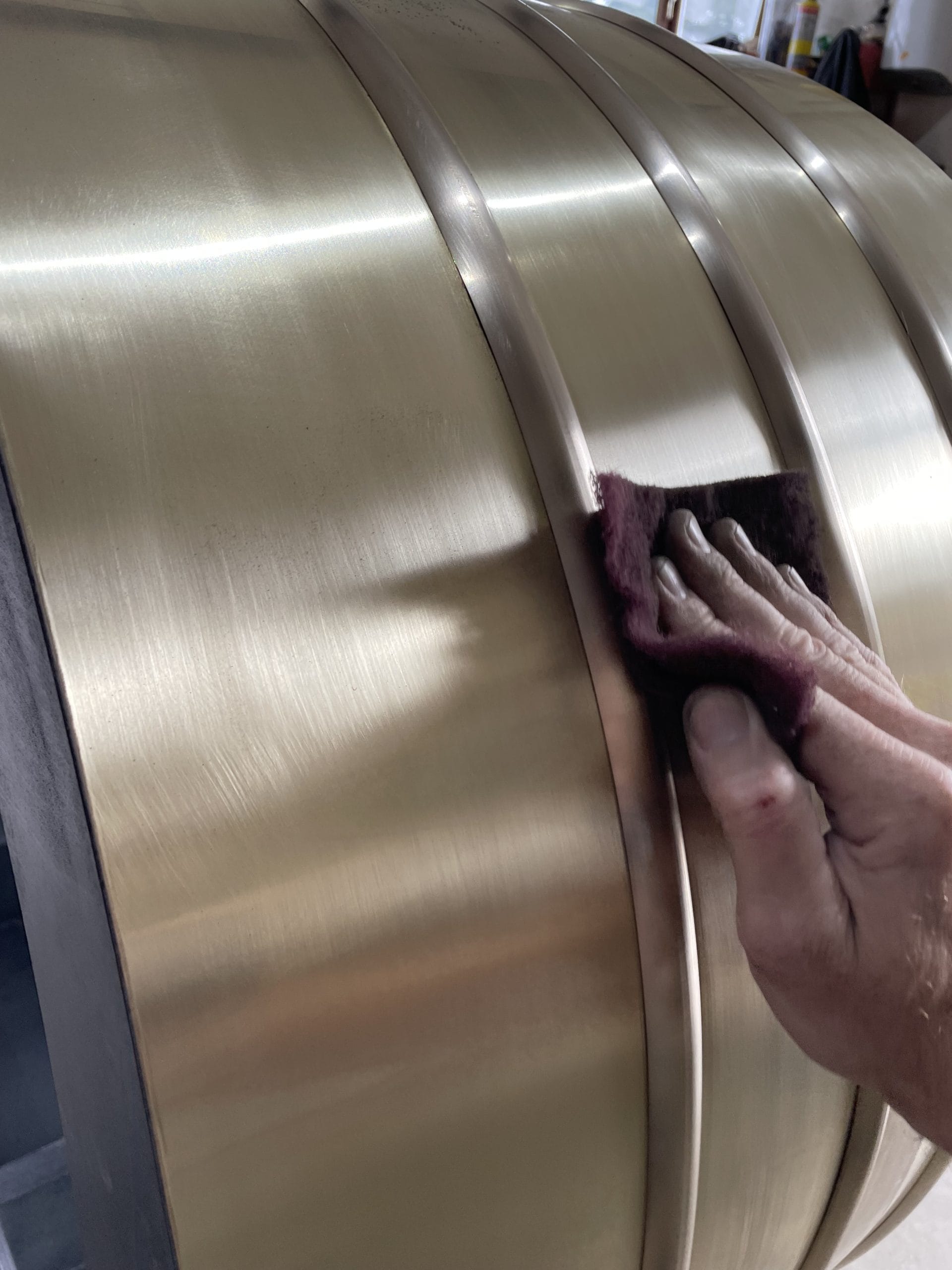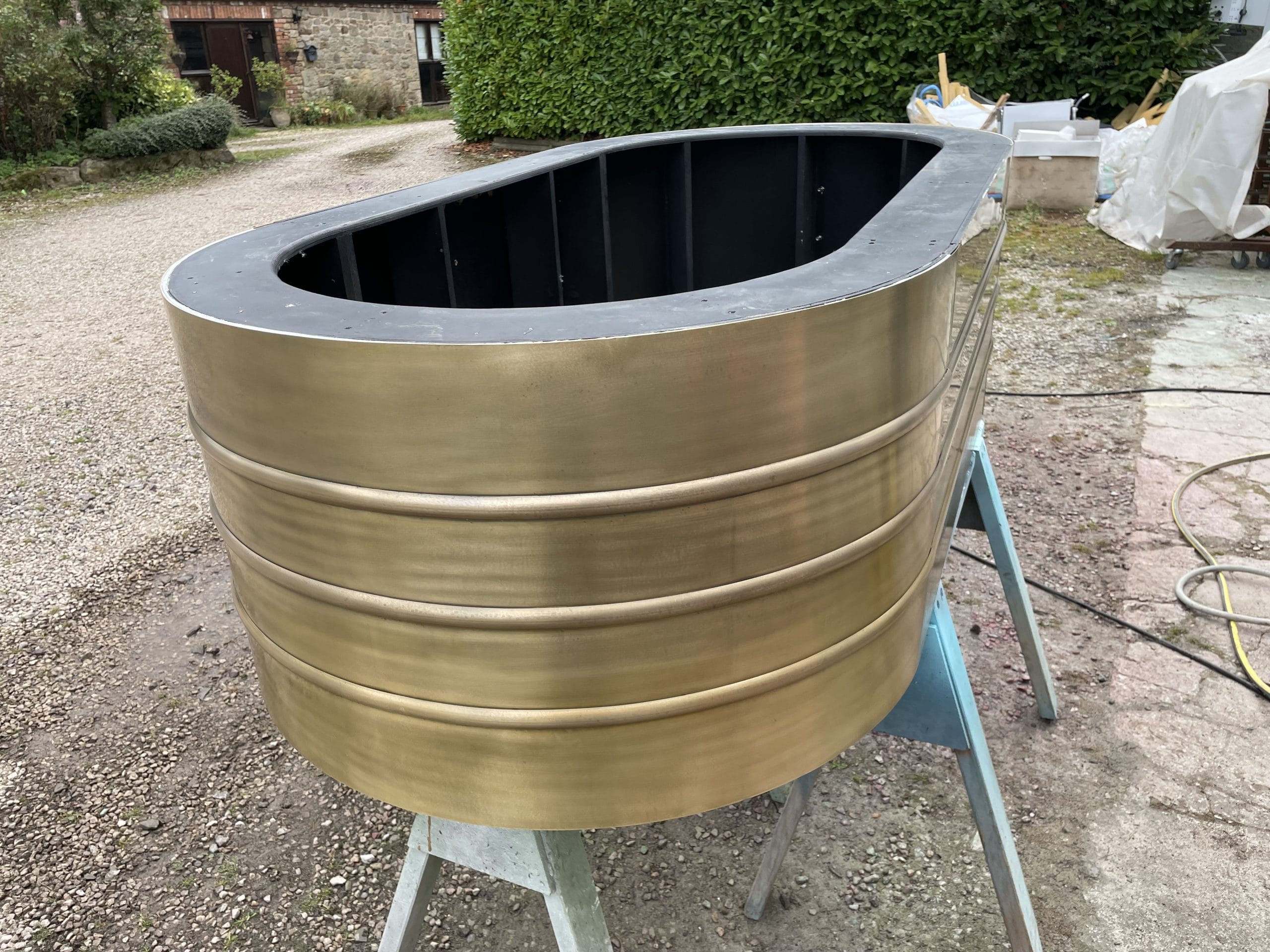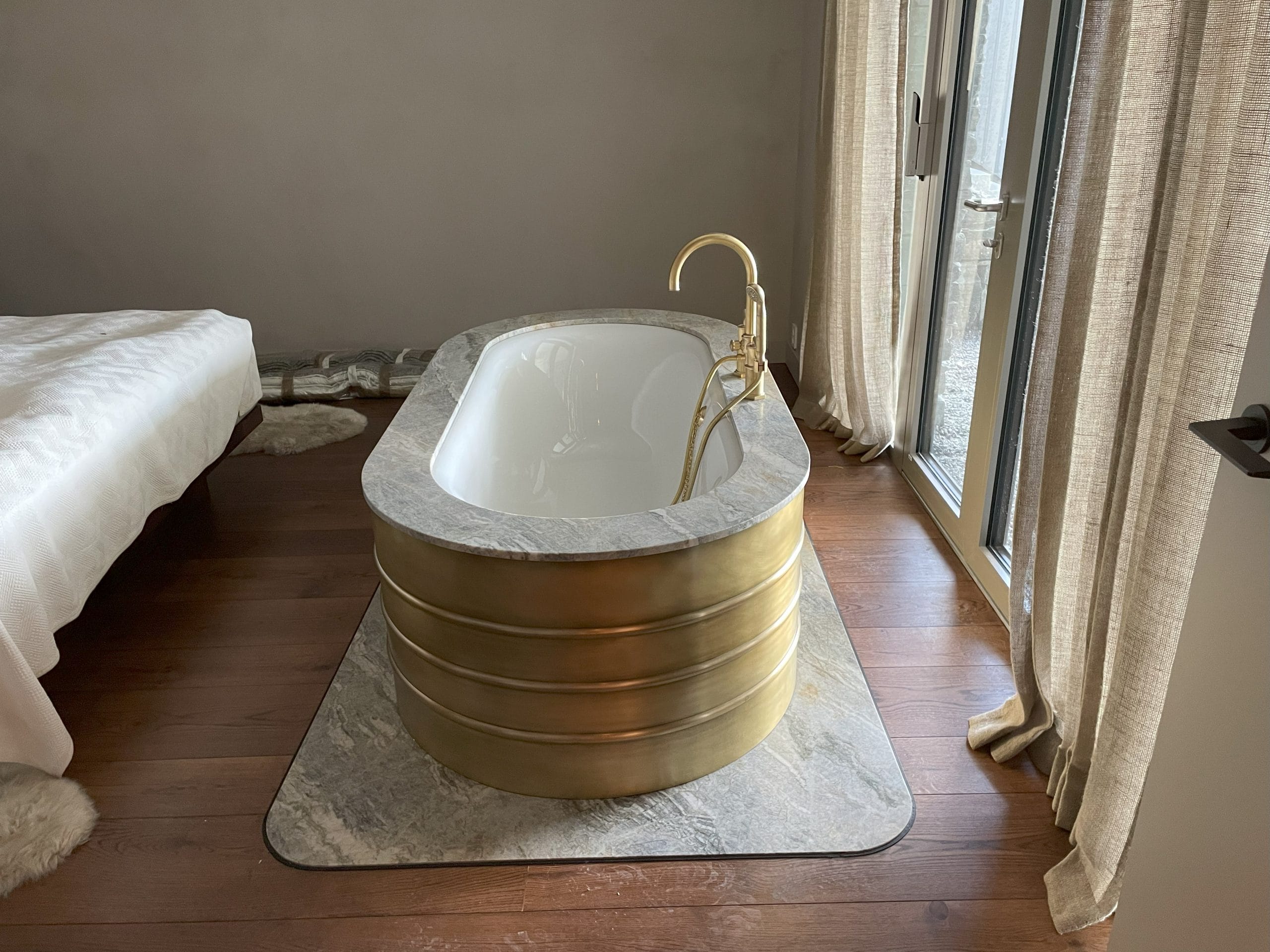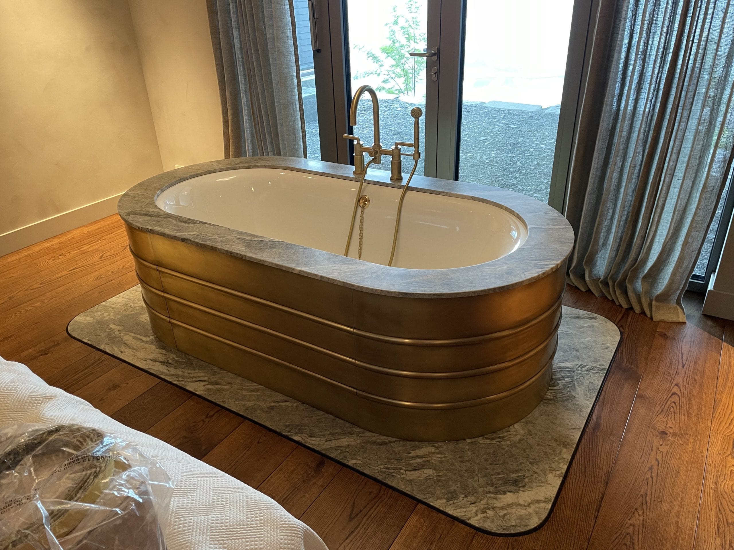 Brass bath surround made from solid brass sheet and d section extrusions with a marble top and base.  Fitted around a birch skeletal frame with discrete access panel for servicing the taps and waste. Materials – brass birch, marble. Finish – polished brass, distressed and patinated with protective Nano coating.
