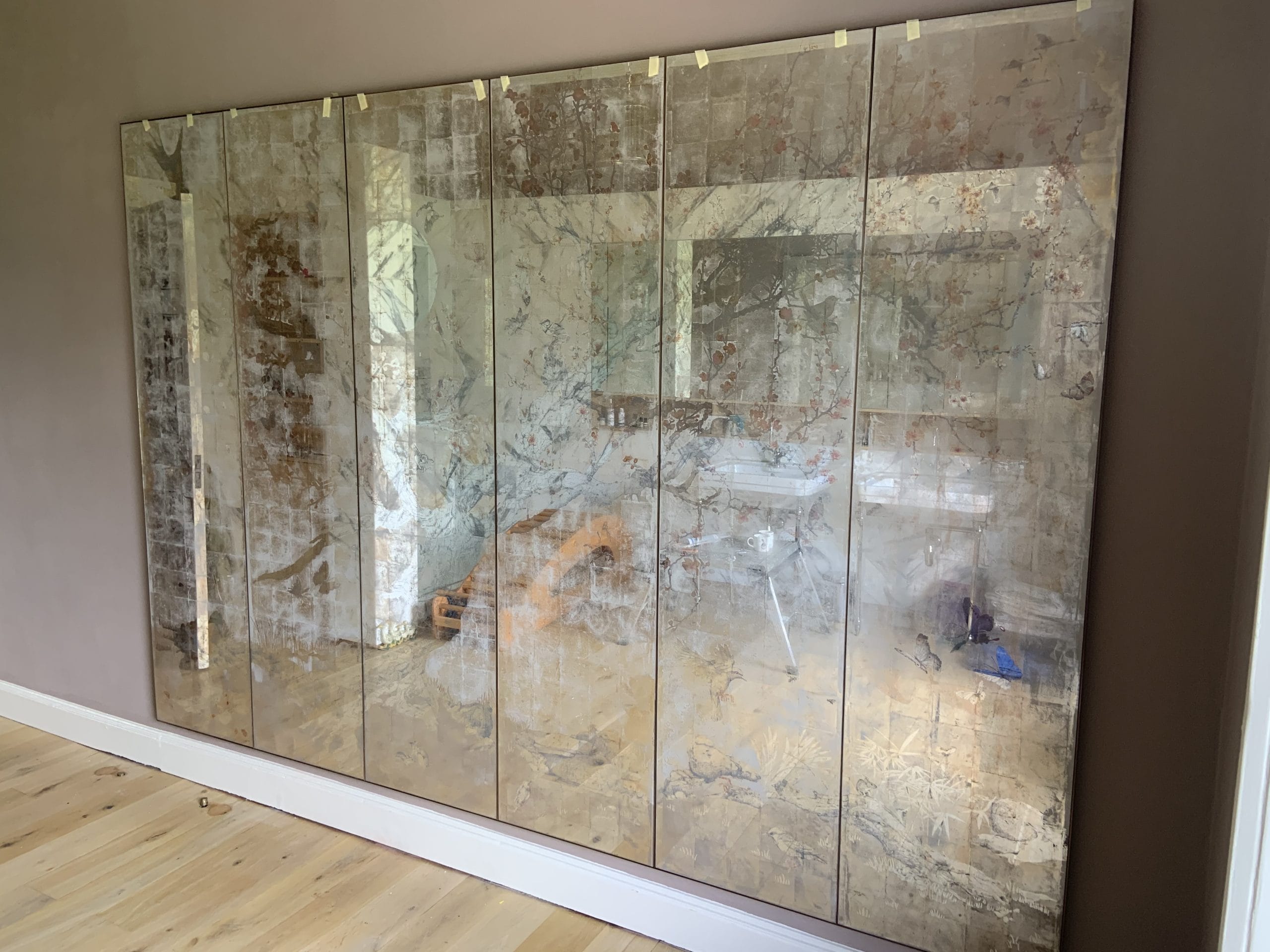 Verre eglomise mirrored wall scene depicting birds and trees framed by a solid brass patinated border.