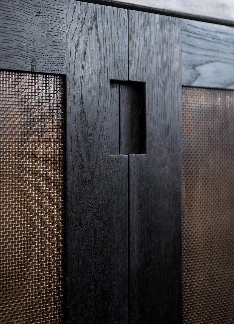Scarified then ebonised oak doors with an oil finish surrounding a patinated brass mesh