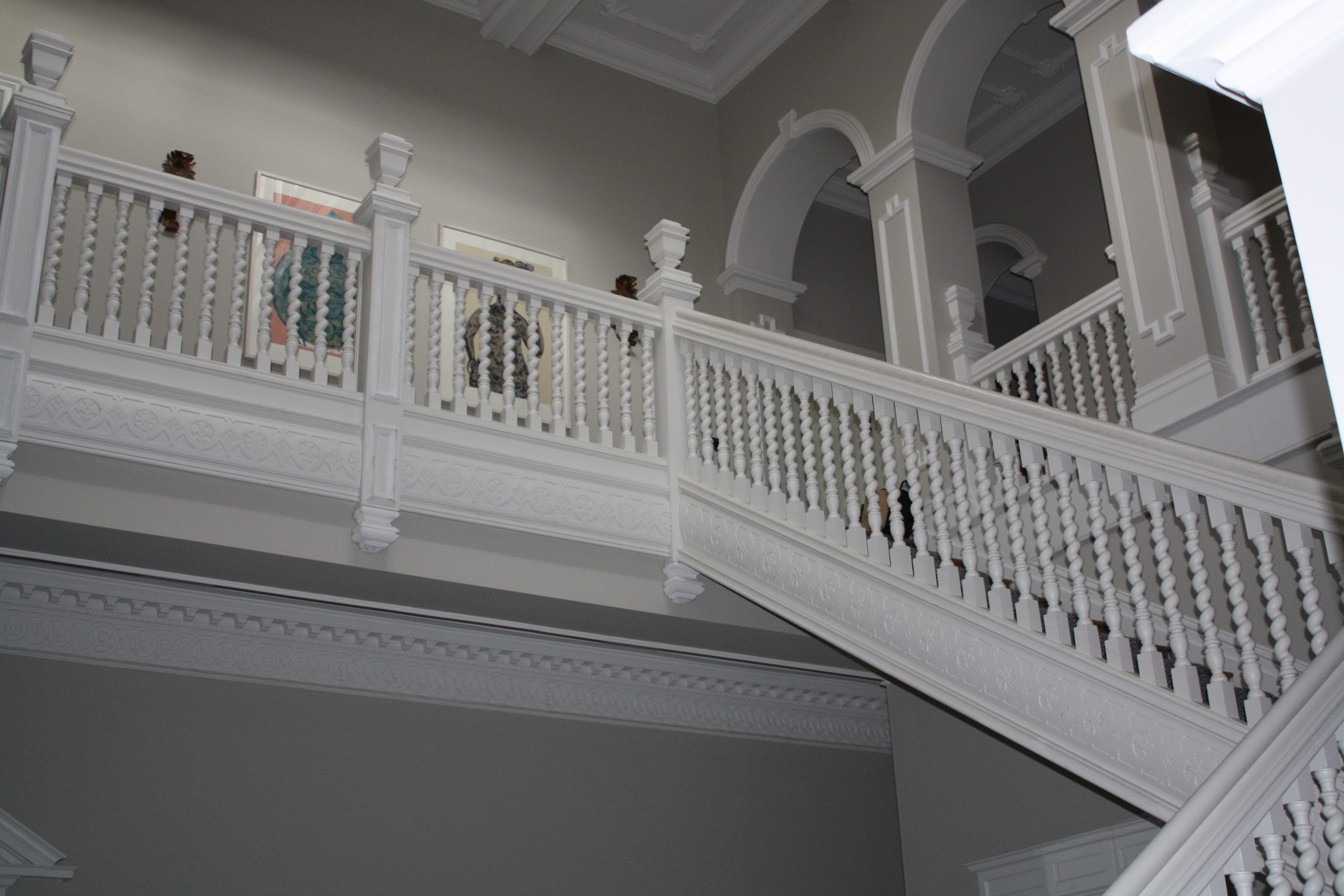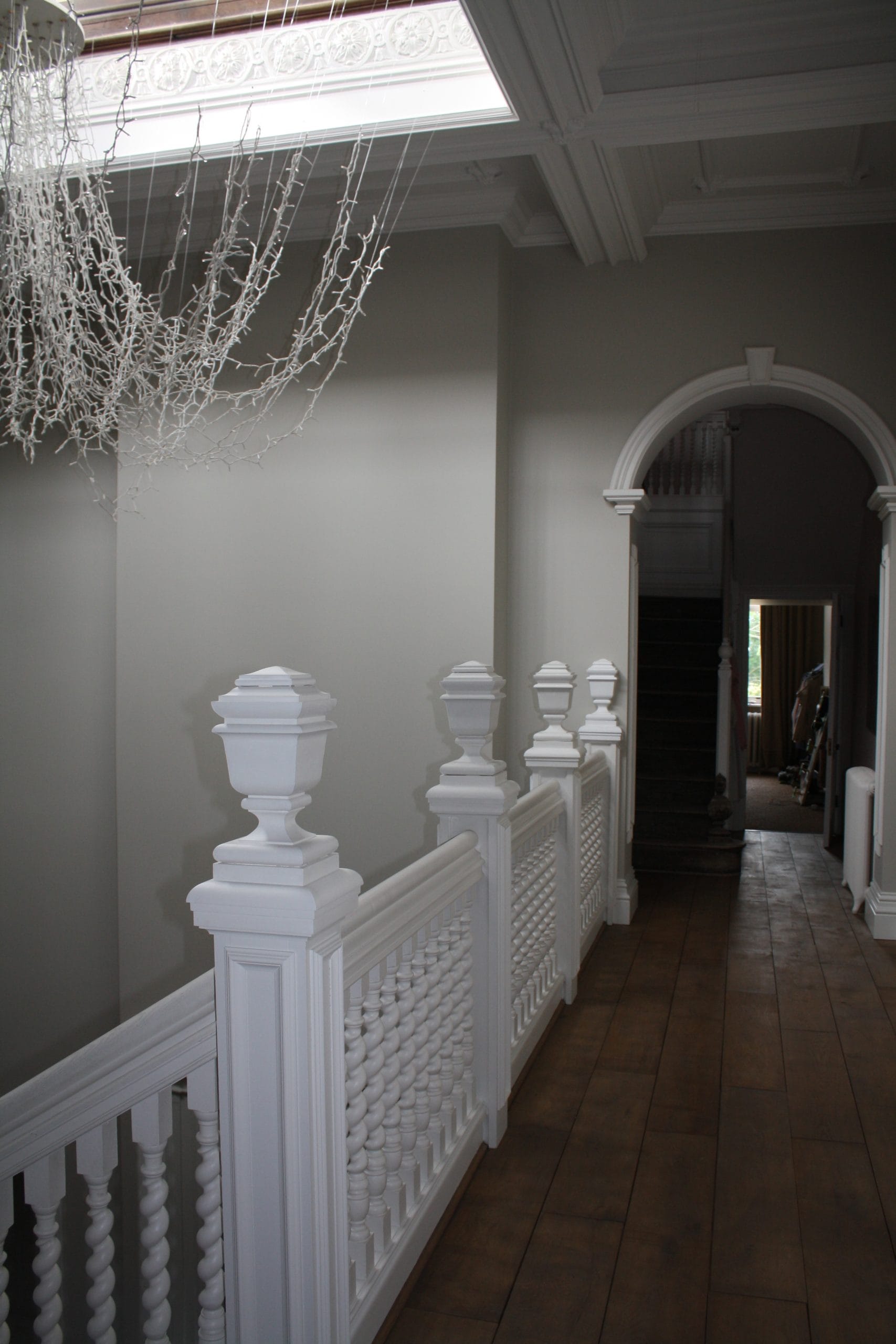 An elaborate staircase with traditional handrails, barley sugar balustrades and heavily moulded newel posts. Off white eggshell paint finish.