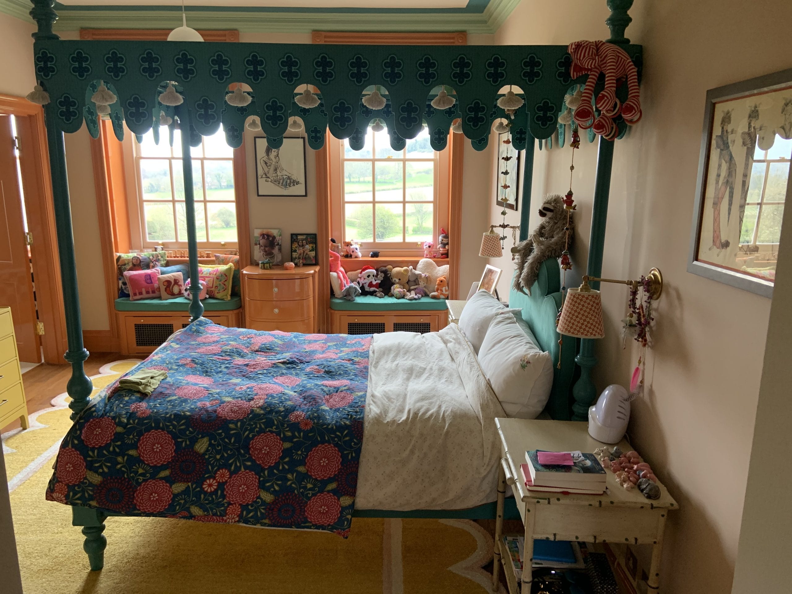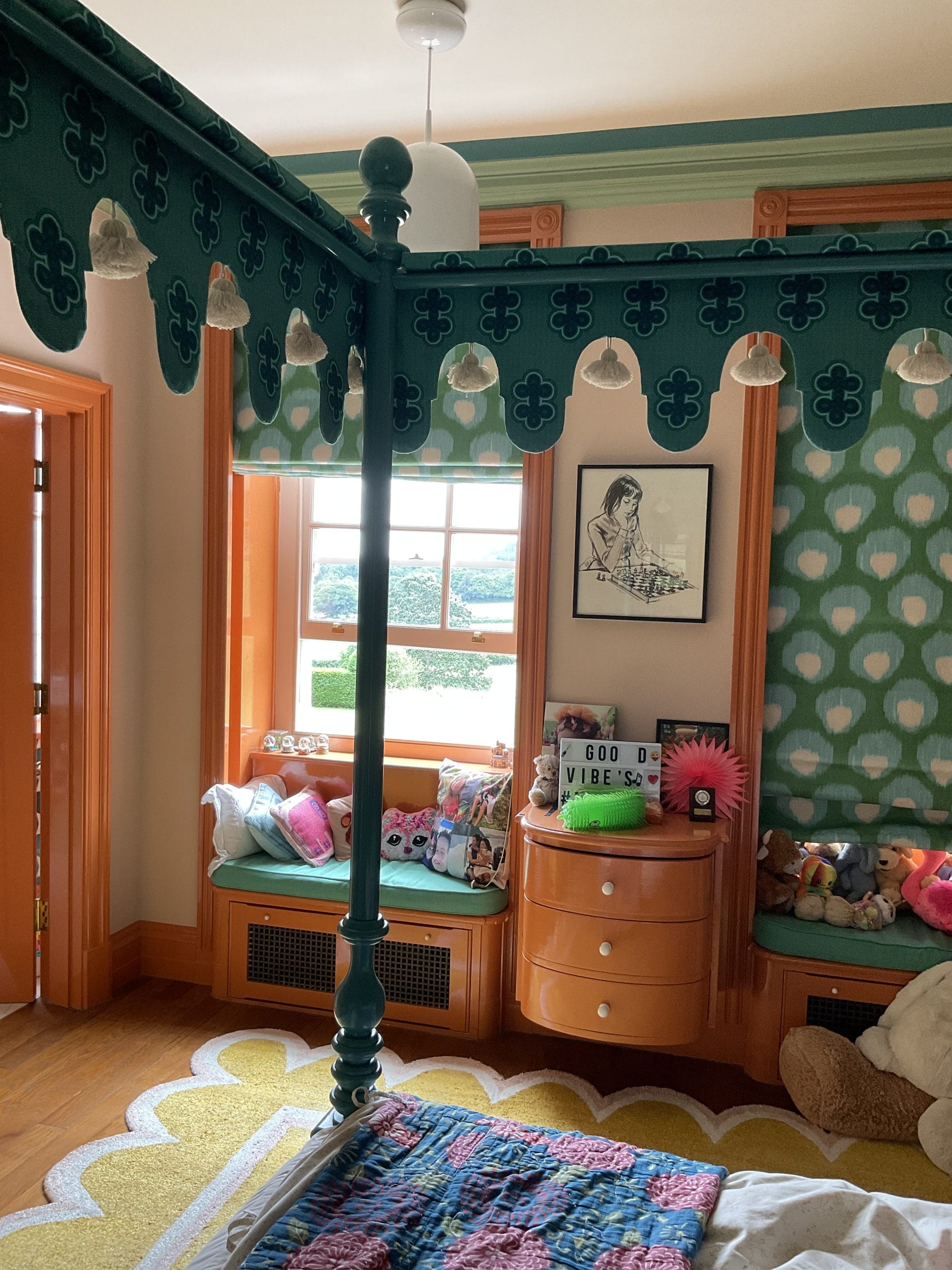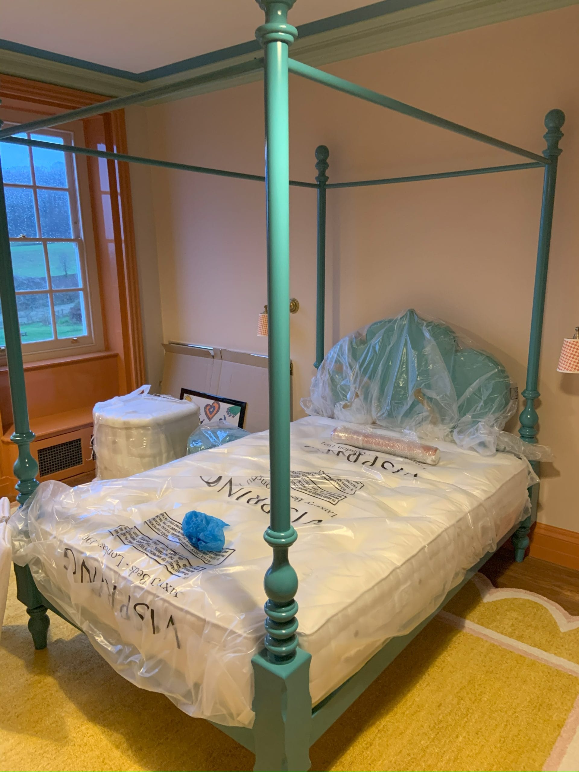 Full gloss double four poster bed. A combination of steel and timber. Mattress sits on solid timber slats, upholstered and padded headboard. Hollow upholstered tester for a lighter feel. Material – Beech, poplar, steel, fabric Finish – Finish: Colour matched gloss sprayed finish for durability.