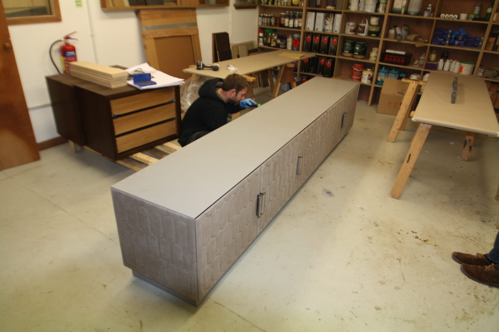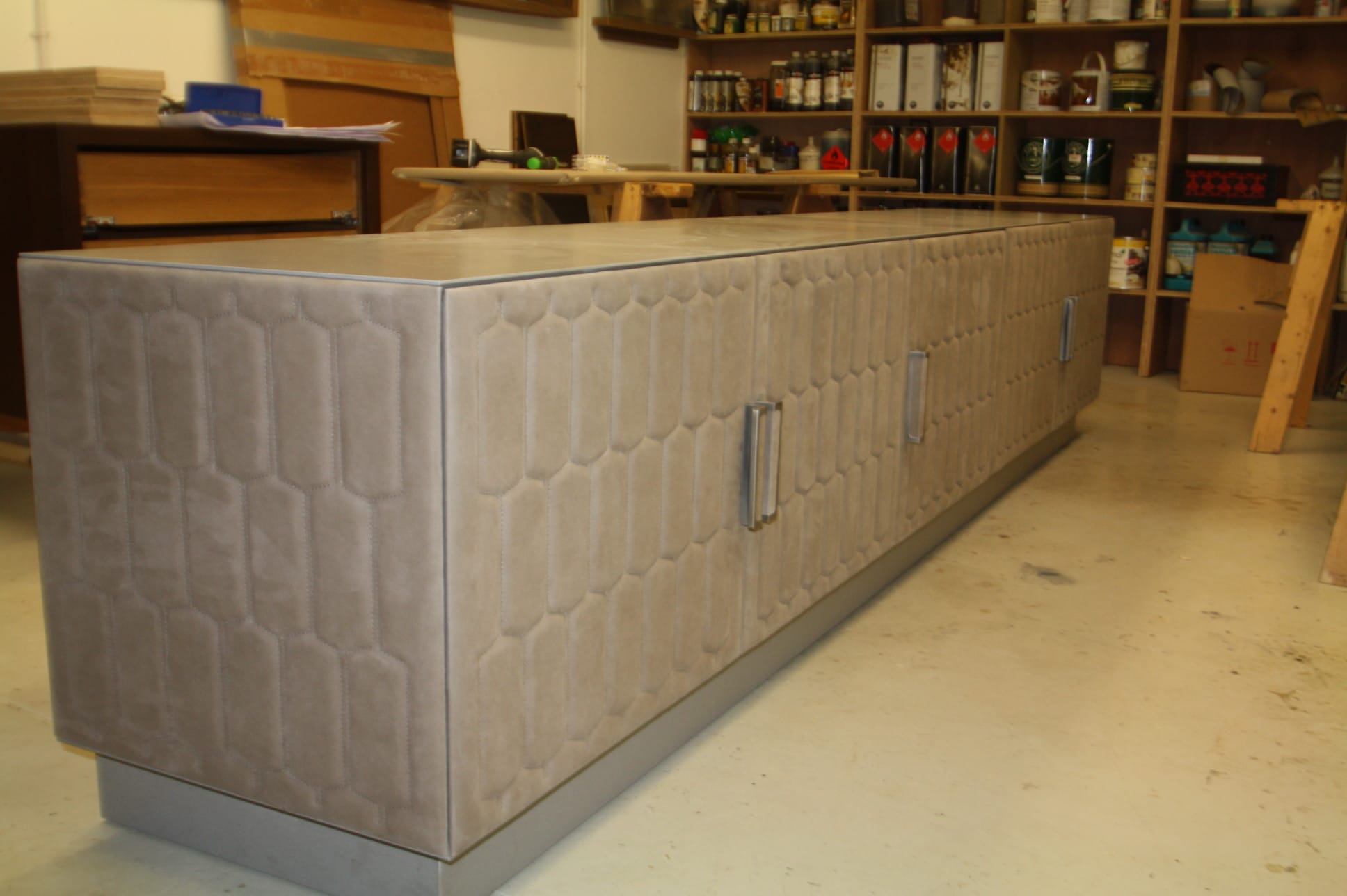 Leather quilted media unit. Bespoke commission with unique finish.