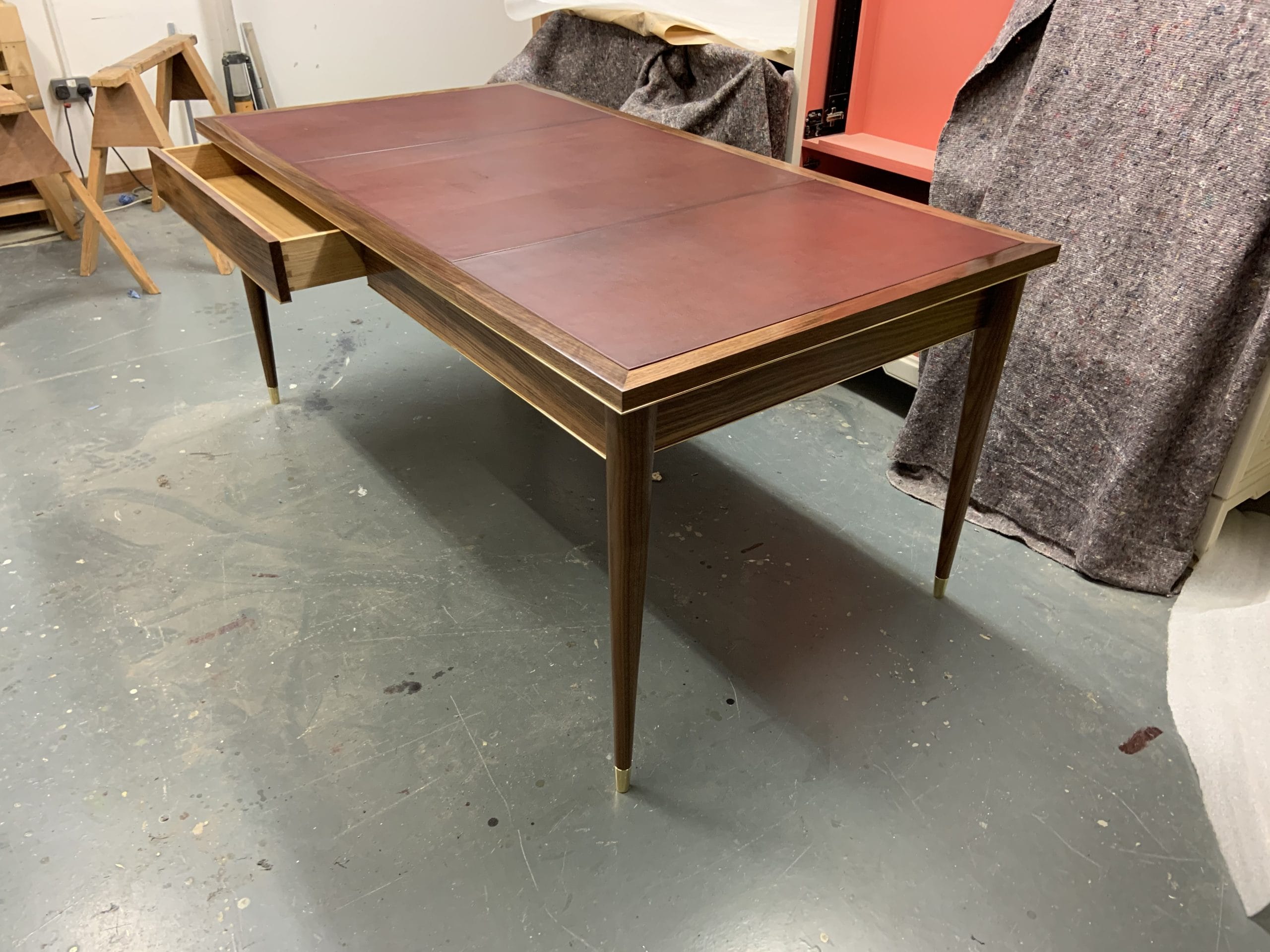 Walnut and leather writing desk with brass inlay, brass raised detailing and brass feet.